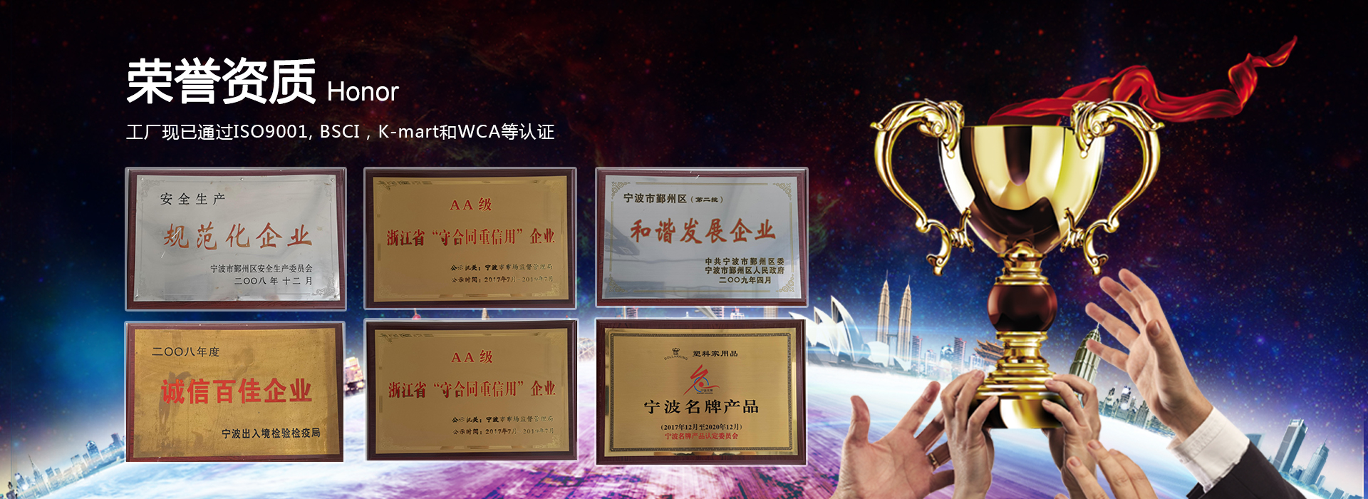 工廠現(xiàn)已通過ISO9001, BSCI,K-mart和WCA等認(rèn)證。